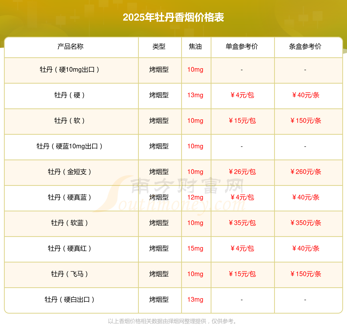以上香煙數(shù)據(jù)整理于網(wǎng)絡(luò),請自行核實(shí)相關(guān)內(nèi)容,因此所引起的后果與本站無關(guān)。