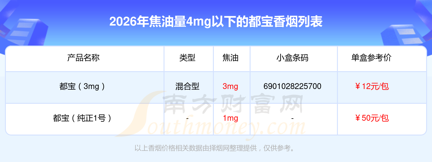 都寶香煙焦油量4mg以下的煙有都寶(3mg)、都寶(純正1號(hào))等,詳細(xì)價(jià)格如下: