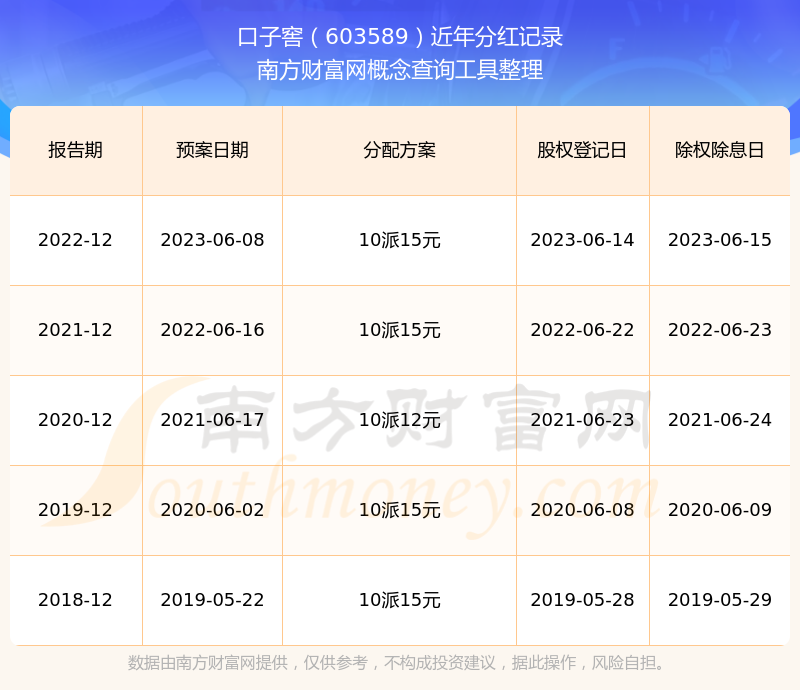 口子窖最新一次公布的分紅方案為10派15元。本次權(quán)益分派股權(quán)登記日為2023年6月14日,除權(quán)除息日為2023年6月15日,派息日為2023年6月15日。