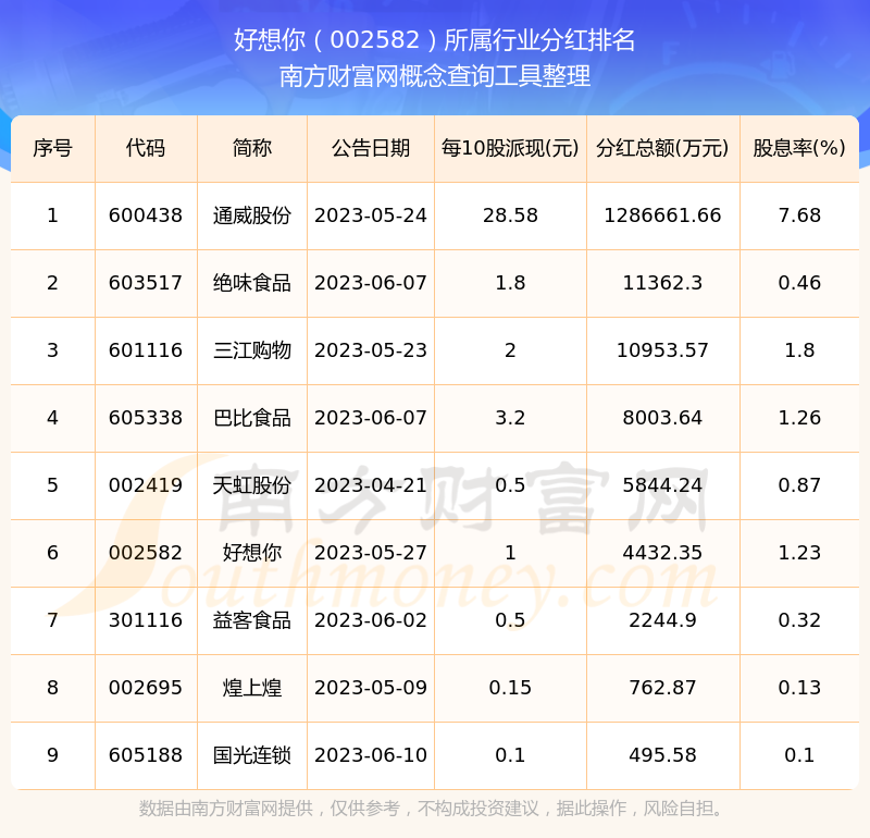 按照南方財(cái)富網(wǎng)趨勢(shì)選股系統(tǒng)統(tǒng)計(jì),好想你所屬行業(yè)為紅棗行業(yè),紅棗行業(yè)分紅排名情況如下表: