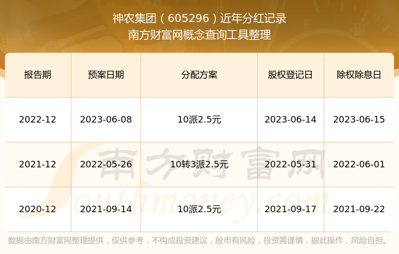神農(nóng)集團(tuán)最新一次公布的分紅方案為10派2.5元。本次權(quán)益分派股權(quán)登記日為2023年6月14日,除權(quán)除息日為2023年6月15日,派息日為2023年6月15日。