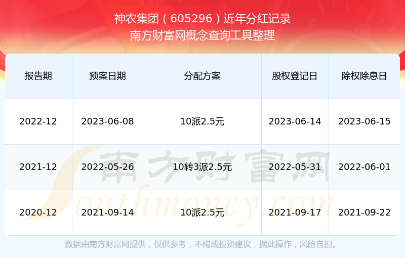 神農(nóng)集團(tuán)最新一次公布的分紅方案為10派2.5元。本次權(quán)益分派股權(quán)登記日為2023年6月14日,除權(quán)除息日為2023年6月15日,派息日為2023年6月15日。