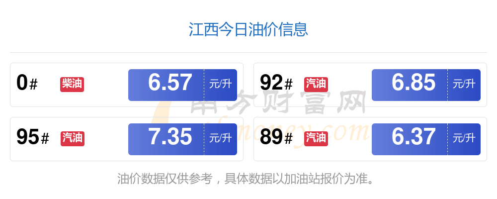 油價調(diào)整最新消息:12月2日江西汽油、柴油的價格多少錢一升?本輪油價調(diào)整時間是11月25日,92號汽油6.85元,減了0.06元,減幅達0.87%;95號汽油7.35元,減了0.06元,減幅達0.81%;89號汽油6.37元,減了0.05元,減幅達0.78%;0號柴油6.57元,減了0.05元,減幅達0.76%。下一輪油價調(diào)整時間12月8日24時。