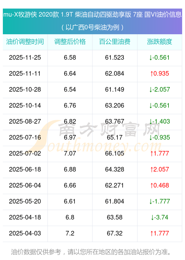依照11月25日0號柴油最新調(diào)整價格6.58元/升來計算(以廣西為例),該車型百公里的平均油費(fèi)是61.523元,依照上一輪11月11日調(diào)整價格6.64元/升來計算,百公里的平均油費(fèi)是62.084元,對比上一輪少花0.561元,下一輪的油價調(diào)整時間12月8日24時。