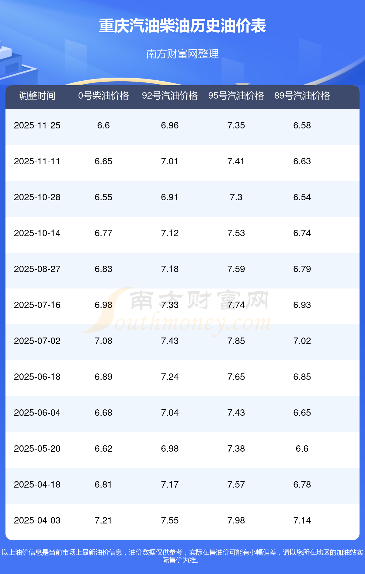 12月2日重慶汽油、柴油價格是多少錢一升?11月25日調(diào)整后,92號汽油為6.96元,跌了0.05元,跌幅達0.71%;95號汽油為7.35元,跌了0.06元,跌幅達0.81%;89號汽油為6.58元,跌了0.05元,跌幅達0.75%;0號柴油為6.6元,跌了0.05元,跌幅達0.75%。
