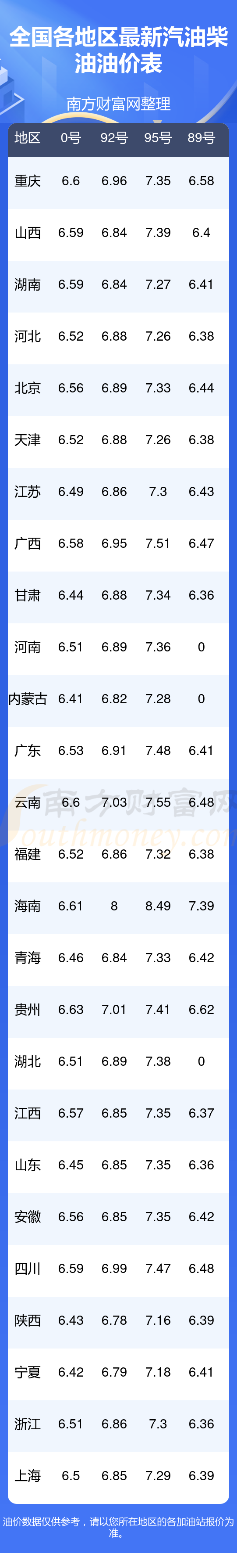 油價數(shù)據(jù)僅供參考,請以您所在地區(qū)的加油站報價為準(zhǔn)。南方財富網(wǎng)發(fā)布此信息的目的在于傳播更多信息,對使用該油價信息所導(dǎo)致的結(jié)果概不承擔(dān)任何責(zé)任。