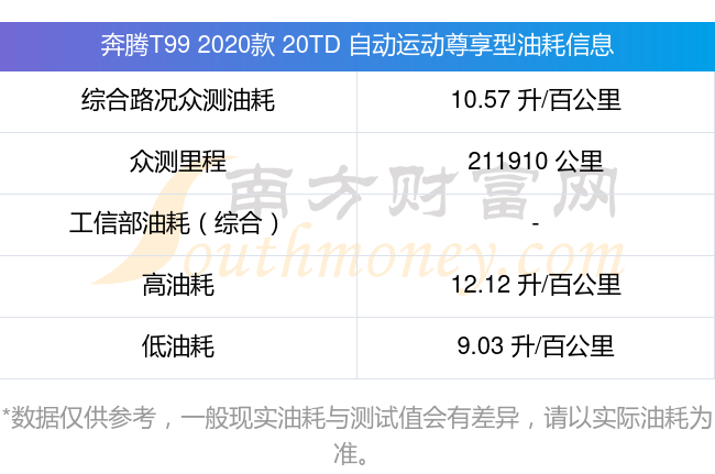 根據(jù)車主實(shí)測數(shù)據(jù),該車型低油耗為9.03升每百公里,高油耗為12.12升每百公里,綜合路況眾測油耗為10.57升每百公里。