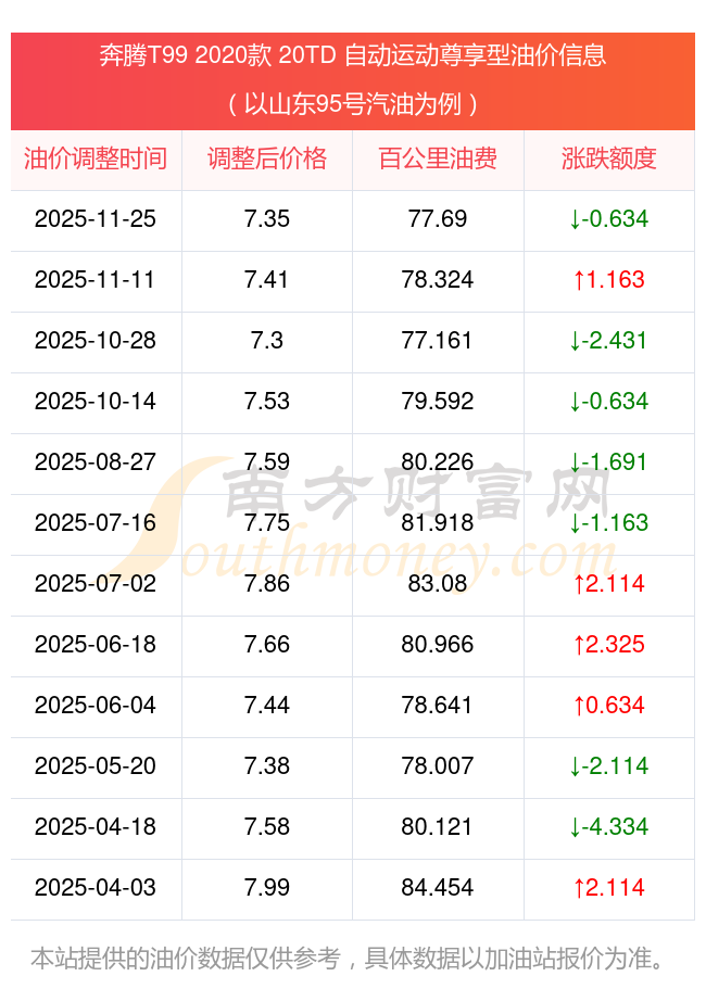 按11月25日95號汽油最新調(diào)整價格7.35元每升來計算(以山東為例),該車型百公里平均油費(fèi)為77.69元,按上一輪11月11日調(diào)整價格7.41元每升來計算,百公里平均油費(fèi)為78.324元,對比上一輪少花0.634元,下一輪油價調(diào)整時間為12月8日24時。