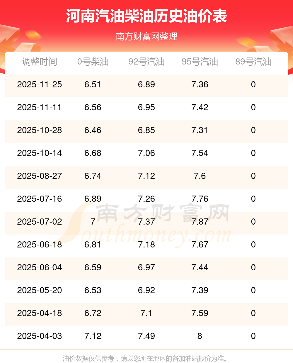 12月2日河南汽油、柴油每升的價格為11月25日調(diào)整后的價格,92號汽油為6.89元,下跌了0.06元,下跌幅達0.86%;95號汽油為7.36元,下跌了0.06元,下跌幅達0.81%;0號柴油為6.51元,下跌了0.05元,下跌幅達0.76%。