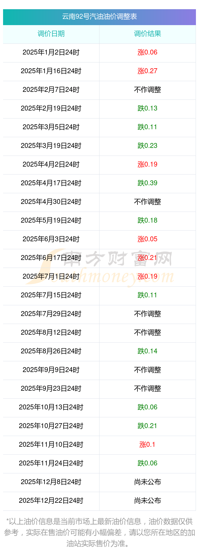 本輪油價的調(diào)整時間為11月25日,調(diào)整后全國92號汽油平均價格為7元每升,其中,最低為陜西的6.78元/升,最高為海南的8.00元/升。全國95號汽油平均價格為7元每升,其中,最低為陜西的7.16元/升,最高為海南的8.49元/升。全國0號柴油平均價格為:7元每升,其中,最低為內(nèi)蒙古的6.41元/升,最高為貴州的6.63元/升。全國89號汽油平均價格為6元每升,其中,最低為浙江的6.36元/升,最高為海南的7.39元/升。下一輪油價調(diào)整時間12月8日24時,距離現(xiàn)在還有6.39天。