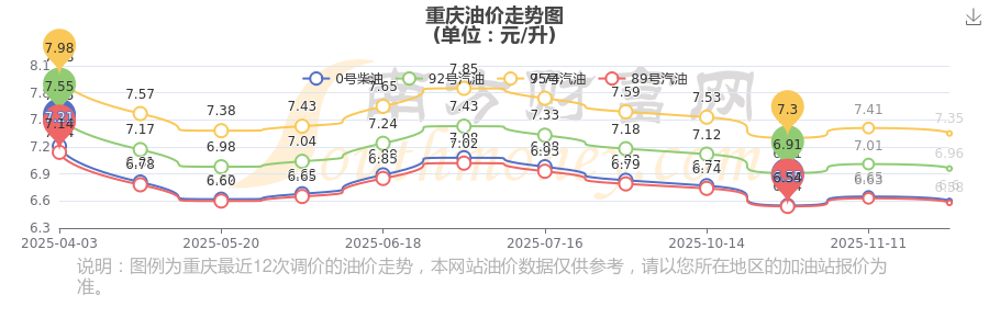 重慶汽油、柴油12月2日每升的價格為11月25日調(diào)整后的價格,具體油價為:92號汽油6.96元;95號汽油7.35元;89號汽油6.58元;0號柴油6.6元。