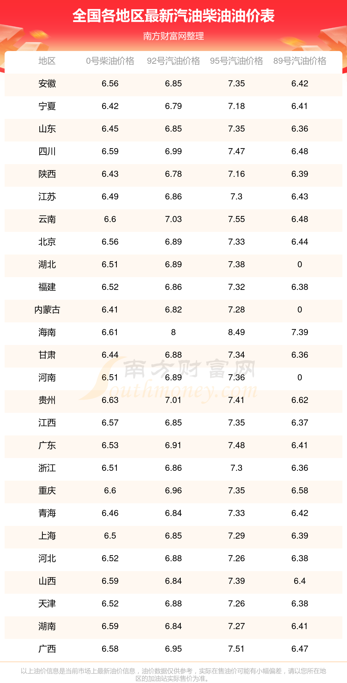 2025年全國各地區(qū)最新油價表