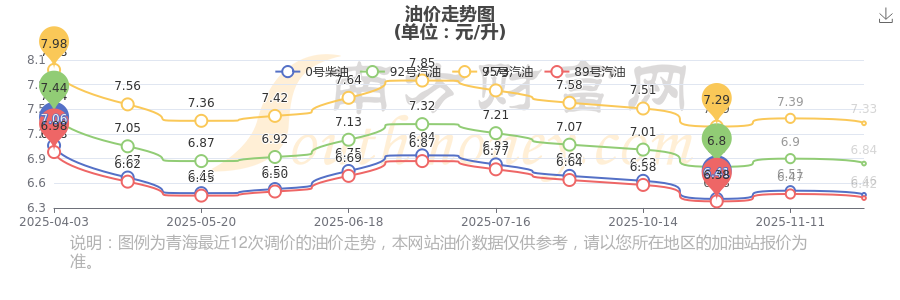 12月2日青海海西95號汽油的價格為7.33元/升,本輪油價的調整時間為11月25日,相對上一輪油價調整時間11月11日的價格7.39元/升,下調了0.06元,下調幅達0.812%。下一輪油價調整時間12月8日24時,距離現(xiàn)在還有6.38天。
