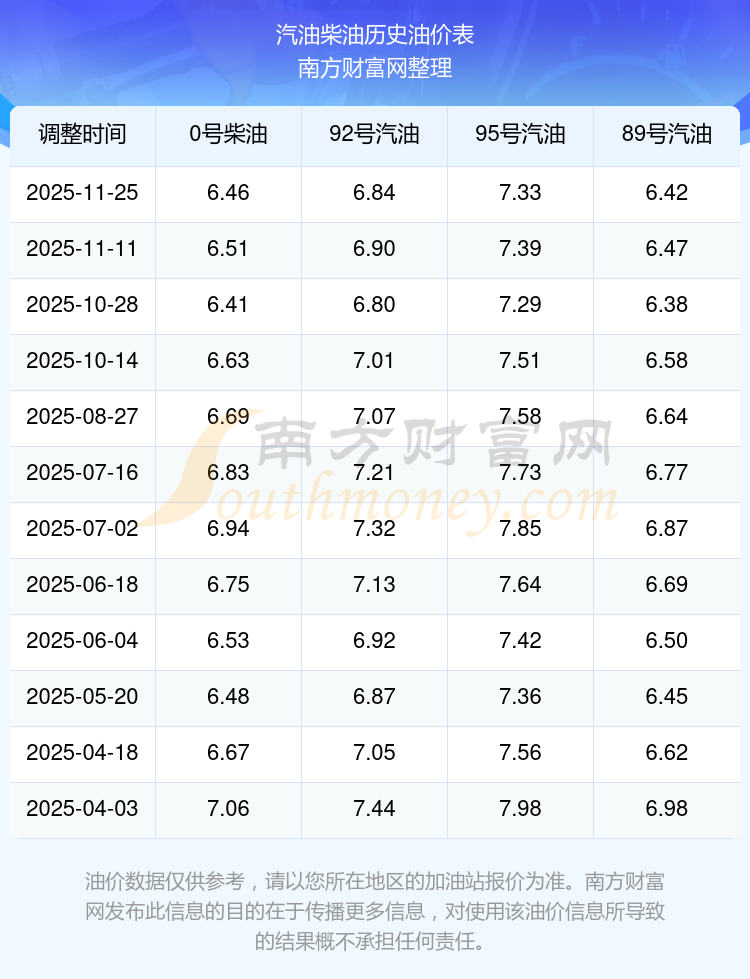 2025年95號汽油價格一覽表