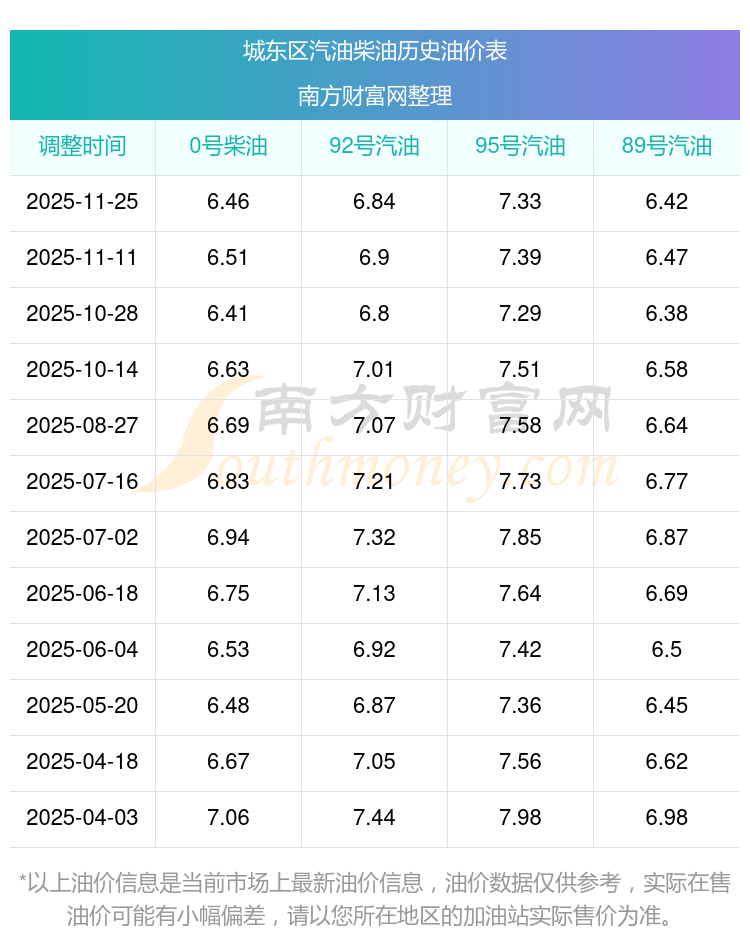 城東區(qū)汽油柴油12月2日的價格每升多少錢?具體為:92號汽油為6.84元,下降了0.06元;95號汽油為7.33元,下降了0.06元;89號汽油為6.42元,下降了0.05元;0號柴油為6.46元,下降了0.05元,本輪油價的調(diào)整時間為11月25日。
