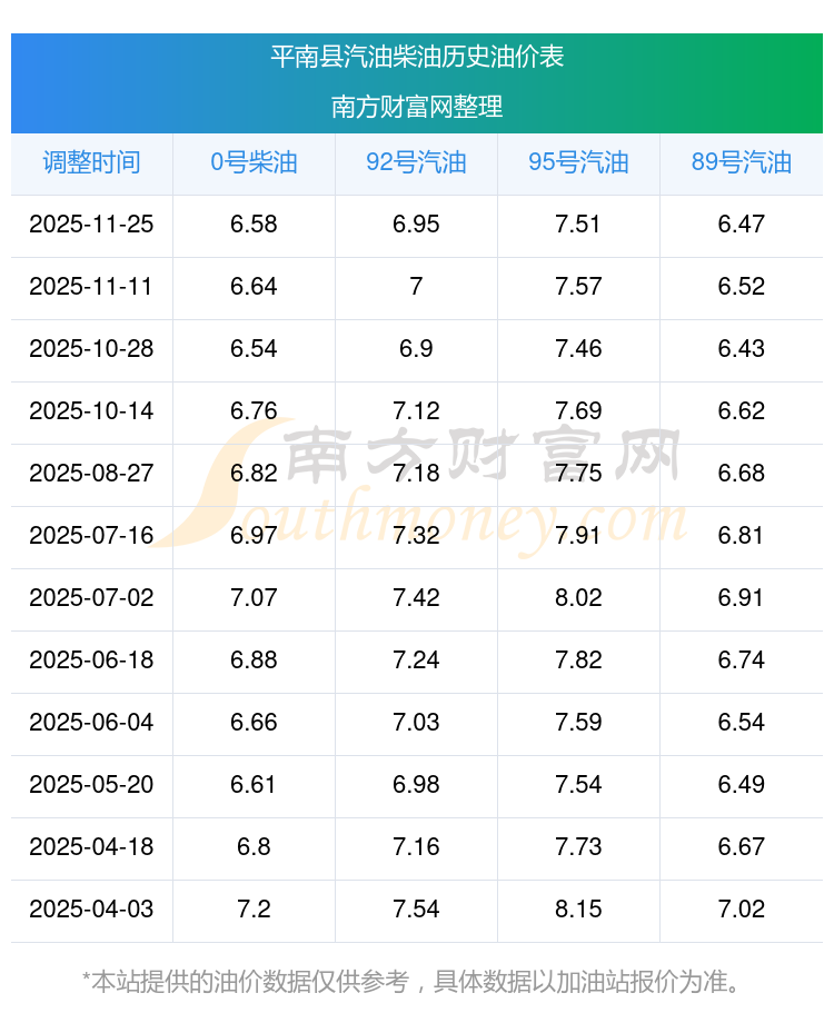 以上數(shù)據(jù)僅供參考,請以您所在地區(qū)的加油站實(shí)際售價(jià)為準(zhǔn)。南方財(cái)富網(wǎng)發(fā)布此信息的目的在于傳播更多信息,對(duì)使用該油價(jià)信息所導(dǎo)致的結(jié)果概不承擔(dān)責(zé)任。