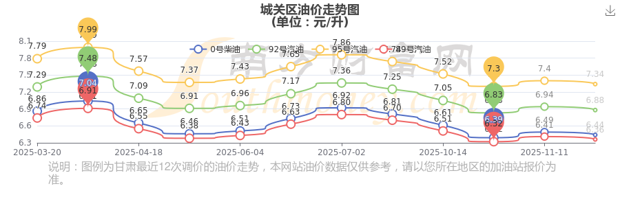 12月2日城關區(qū)汽油柴油每升的價格為11月25日調(diào)整后的價格,具體如下:92號汽油6.88元;95號汽油7.34元;89號汽油6.36元;0號柴油6.44元。
