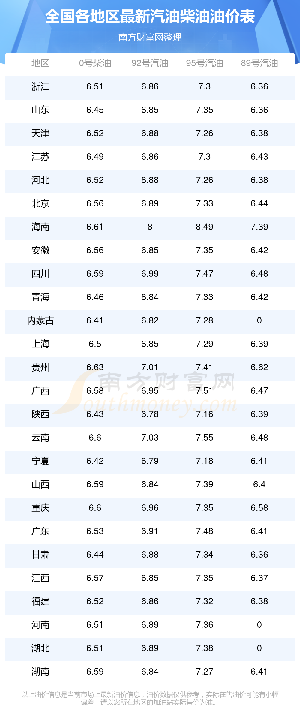 全國各地區(qū)最新油價表