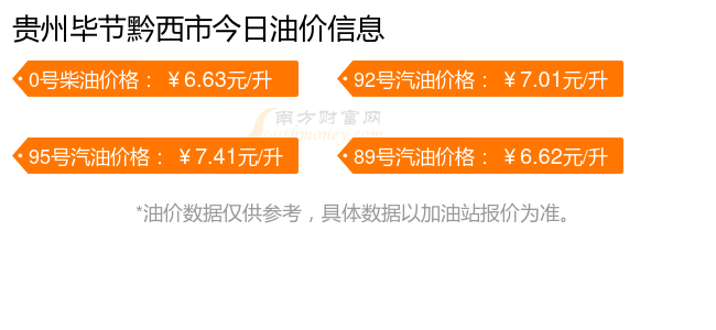 貴州畢節(jié)黔西市汽油柴油12月2日的價格每升多少錢?具體為:92號汽油為7.01元,降了0.06元;95號汽油為7.41元,降了0.06元;89號汽油為6.62元,降了0.05元;0號柴油為6.63元,降了0.06元,本輪油價的調(diào)整時間為11月25日。下一輪油價調(diào)整時間12月8日24時。