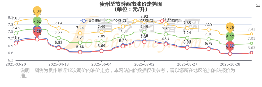 貴州畢節(jié)黔西市12月2日0號柴油歷史油價調(diào)整走勢圖