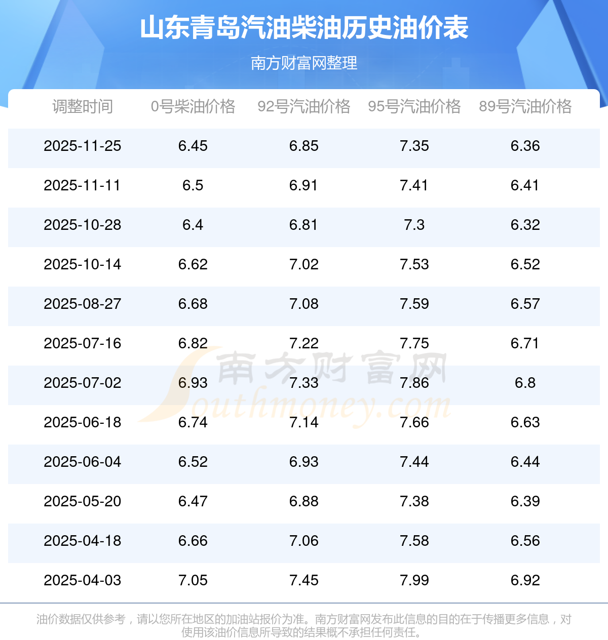 油價調(diào)整最新消息:12月2日山東青島汽油柴油每升的價格為11月25日調(diào)整后的價格,具體如下:92號汽油6.85元;95號汽油7.35元;89號汽油6.36元;0號柴油6.45元。山東青島下一輪油價調(diào)整時間12月8日24時,距離現(xiàn)在還有6.33天。