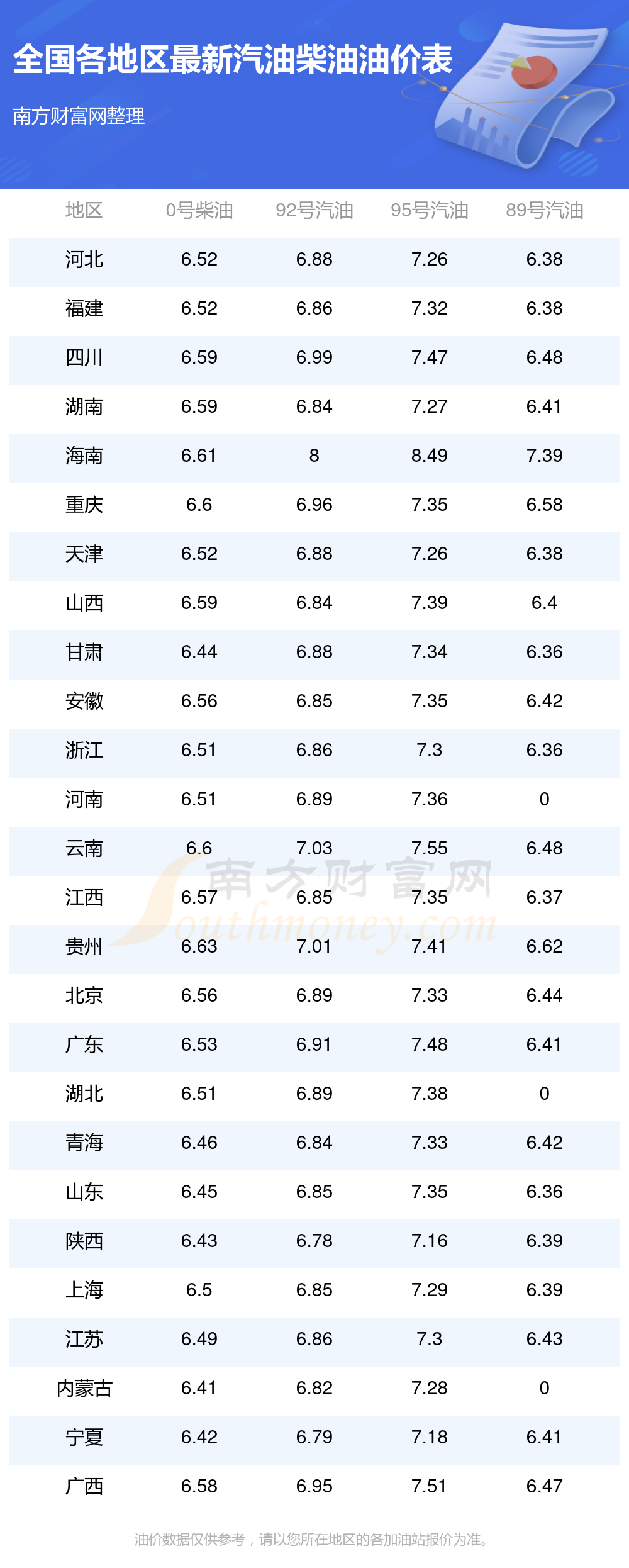 本輪油價的調整時間為11月25日,調整后全國92號汽油平均價格為7元每升,其中,最低為陜西的6.78元/升,最高為海南的8.00元/升。全國95號汽油平均價格為7元每升,其中,最低為陜西的7.16元/升,最高為海南的8.49元/升。全國0號柴油平均價格為:7元每升,其中,最低為內蒙古的6.41元/升,最高為貴州的6.63元/升。全國89號汽油平均價格為6元每升,其中,最低為浙江的6.36元/升,最高為海南的7.39元/升。,下一輪油價調整時間12月8日24時,距離現在還有6.33天。