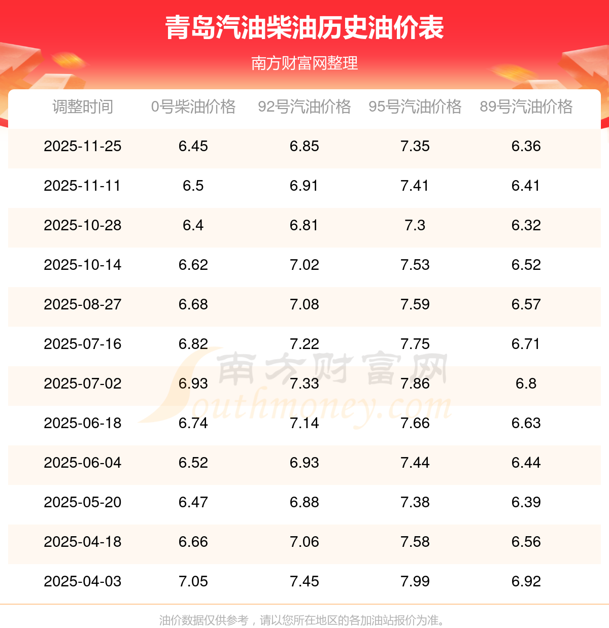 青島汽油柴油歷史油價表