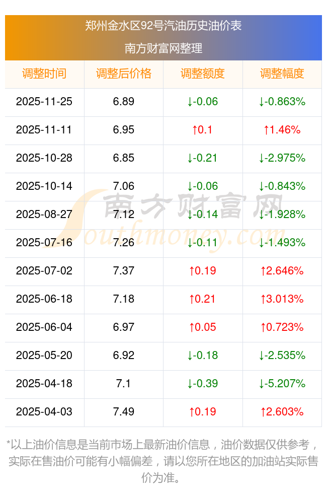 鄭州金水區(qū)92號(hào)汽油歷史油價(jià)表