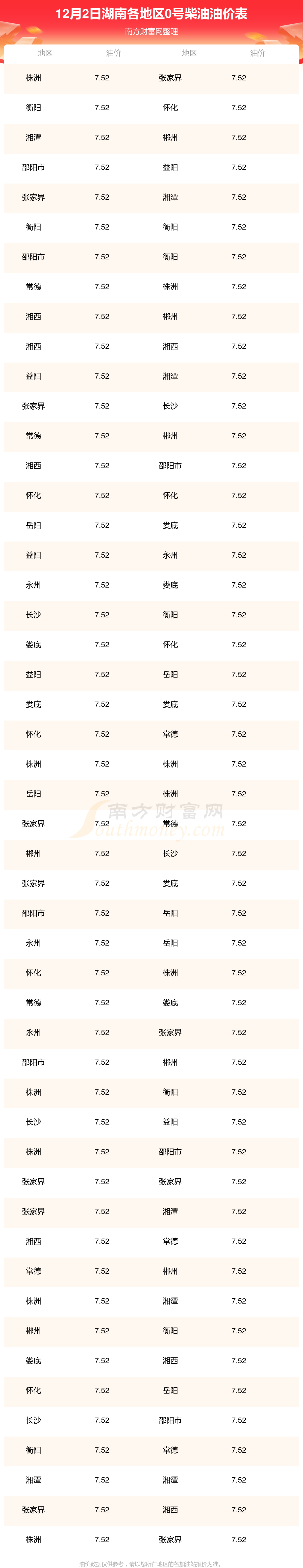 12月2日,湖南0號柴油的價格是6.59元每升,本次的調(diào)整時間為11月25日,對比上次的調(diào)整降了0.06元,降0.844%,12月8日24時為下一輪油價調(diào)整時間,還有6.3天。