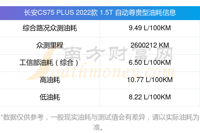 根據(jù)多位車主實測得出數(shù)據(jù),該車型低油耗為8.22升每百公里,高油耗為10.77升每百公里,綜合路況眾測油耗為9.49升每百公里,工信部綜合油耗為6.50升每百公里。