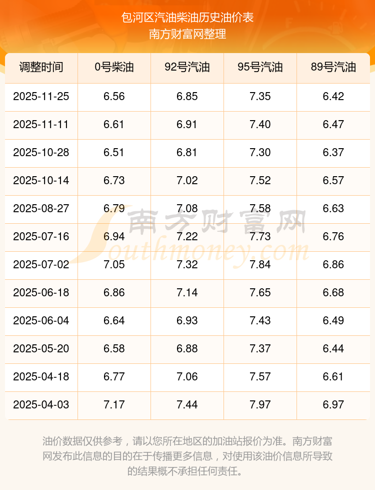 以上數(shù)據(jù)僅供參考,請以您所在地區(qū)的加油站實際售價為準。南方財富網(wǎng)發(fā)布此信息的目的在于傳播更多信息,對使用該油價信息所導(dǎo)致的結(jié)果概不承擔責任。