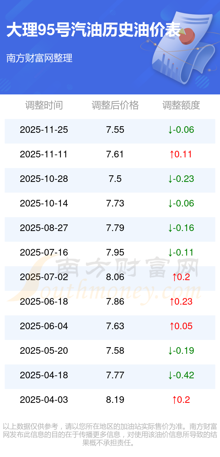 12月2日大理95號汽油的價格是7.55元/升(調(diào)整時間為11月25日),對比上次調(diào)整時間11月11日的油價7.61元/升,跌了0.06元,跌幅達0.788%。