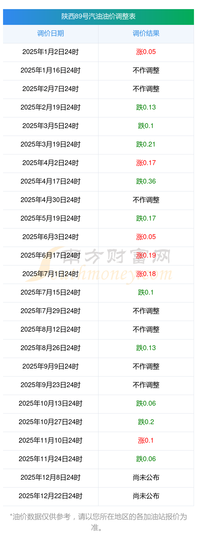 陜西楊凌89號汽油12月2日的價格為6.39元/升,本次油價的調(diào)整時間為11月25日,對比上次油價調(diào)整時間11月11日的價格6.45元/升,共下調(diào)了0.06元,下調(diào)幅達0.93%。