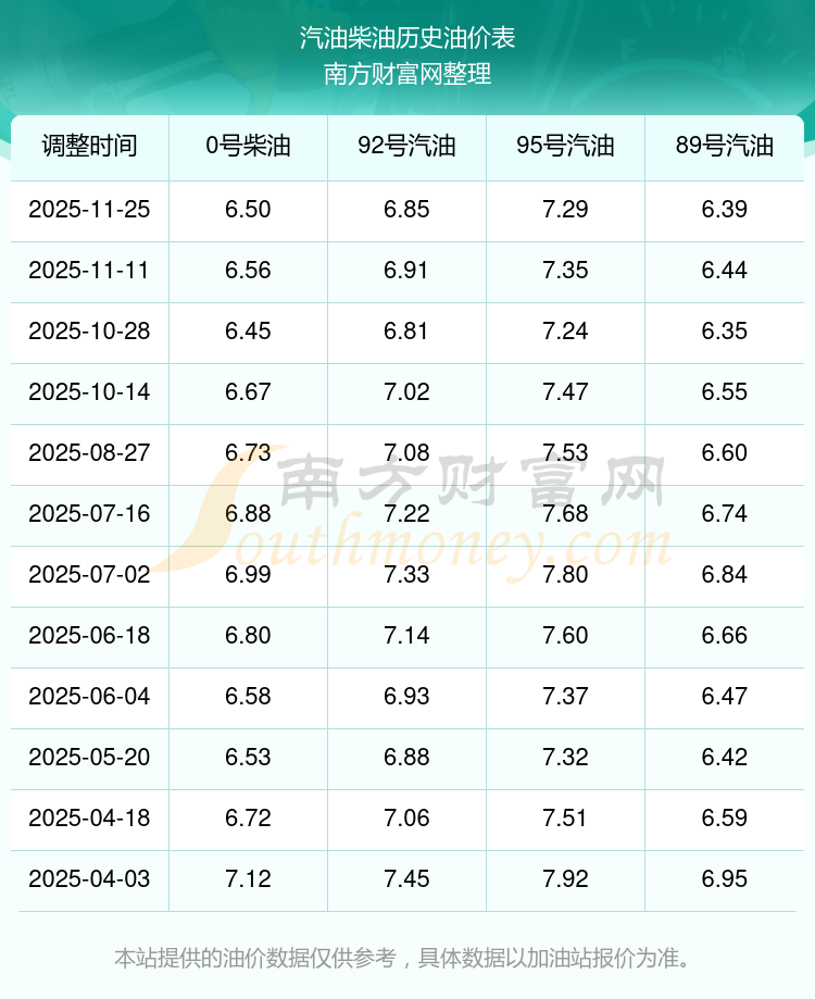 2025年95號汽油價格一覽表