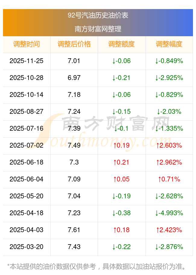 12月2日汽油價(jià)格詳情:92號(hào)汽油7.01元;95號(hào)汽油7.41元;89號(hào)汽油6.62元;0號(hào)柴油6.63元(該價(jià)格為11月25日調(diào)整后的價(jià)格)。