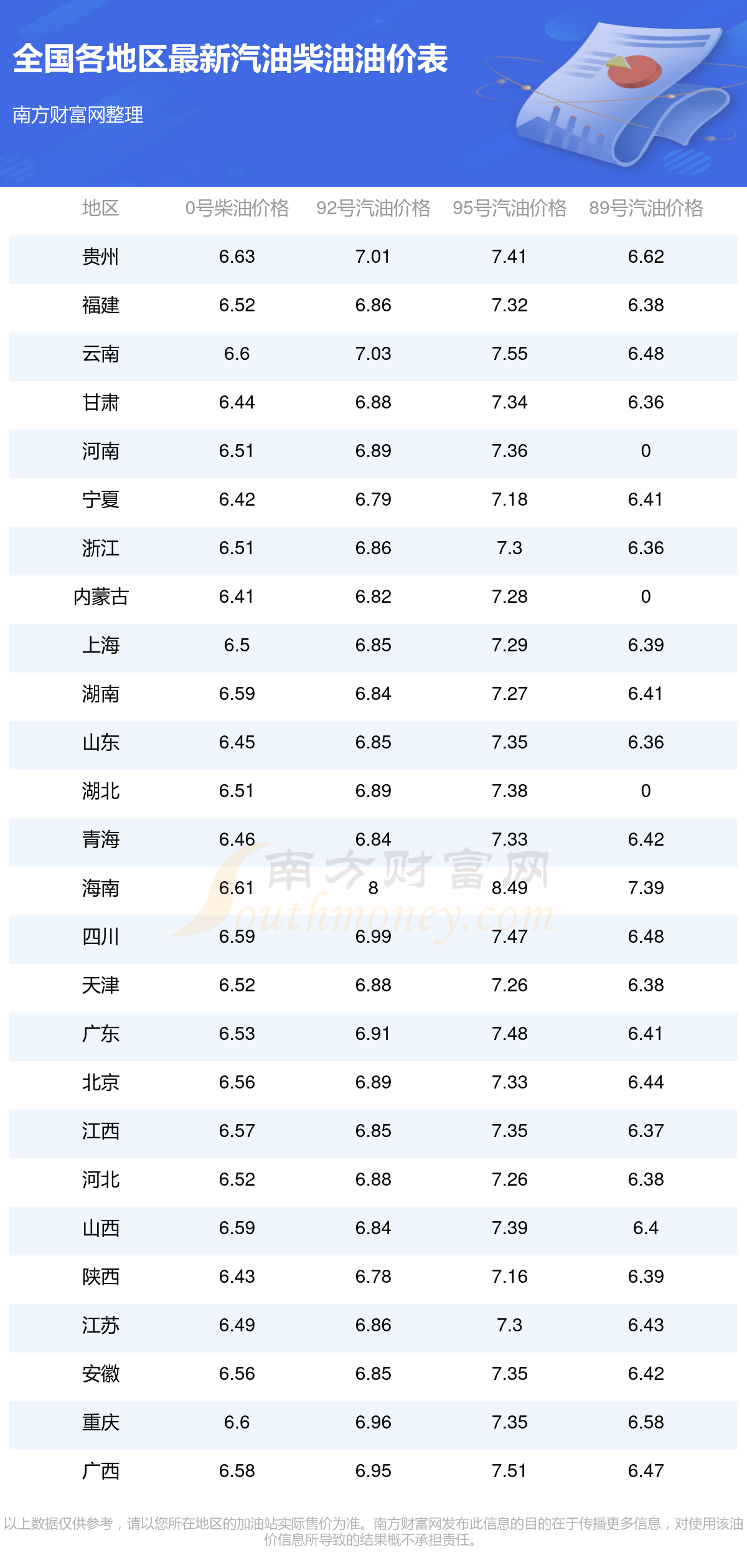 全國89號汽油平均價格為:6元每升,其中,最低為浙江,價格6.36元/升,最高為海南,價格7.39元/升。