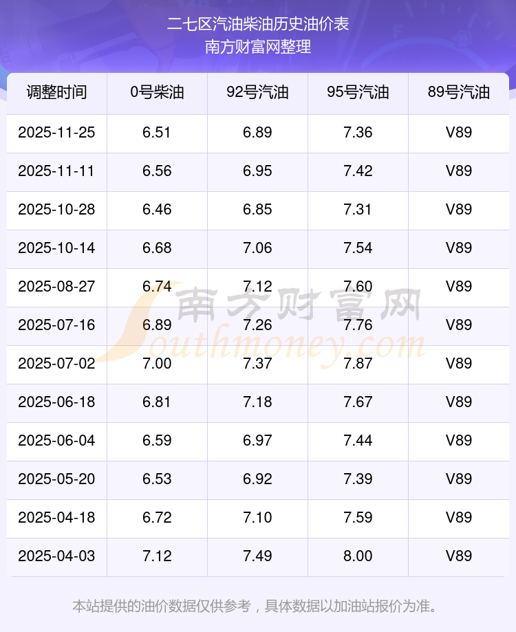 以上數(shù)據(jù)僅供參考,請以您所在地區(qū)的加油站實(shí)際售價為準(zhǔn)。南方財(cái)富網(wǎng)發(fā)布此信息的目的在于傳播更多信息,對使用該油價信息所導(dǎo)致的結(jié)果概不承擔(dān)責(zé)任。