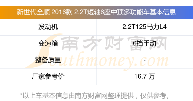 在動力方面,新世代全順 2016款 2.2T短軸6座中頂多功能車搭載的是一臺2.2T125馬力L4渦輪增壓發(fā)動機,匹配6擋手動擋變速箱,燃料形式為柴油,廠家參考價16.7萬元。