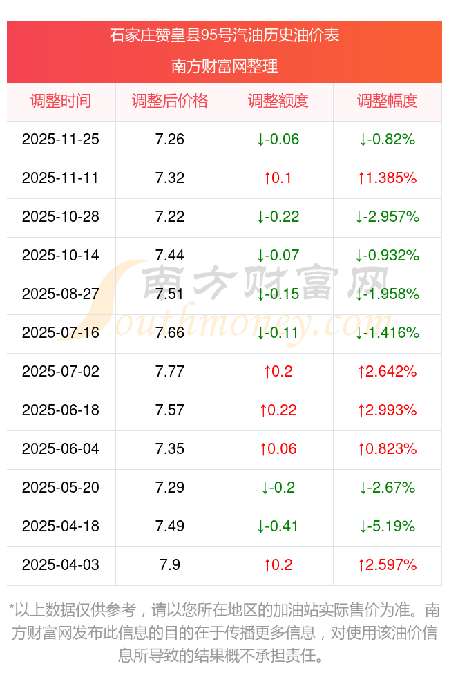 石家莊贊皇縣95號汽油歷史油價一覽表