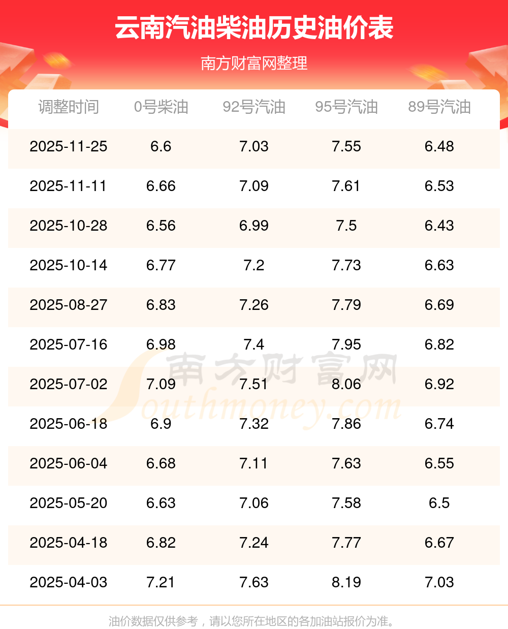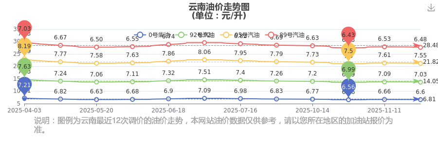 云南汽油、柴油12月2日每升最新價格為11月25日調(diào)整后的價格,具體為:92號汽油7.03元,跌了0.06元;95號汽油7.55元,跌了0.06元;89號汽油6.48元,跌了0.05;0號柴油6.6元,跌了0.06元。