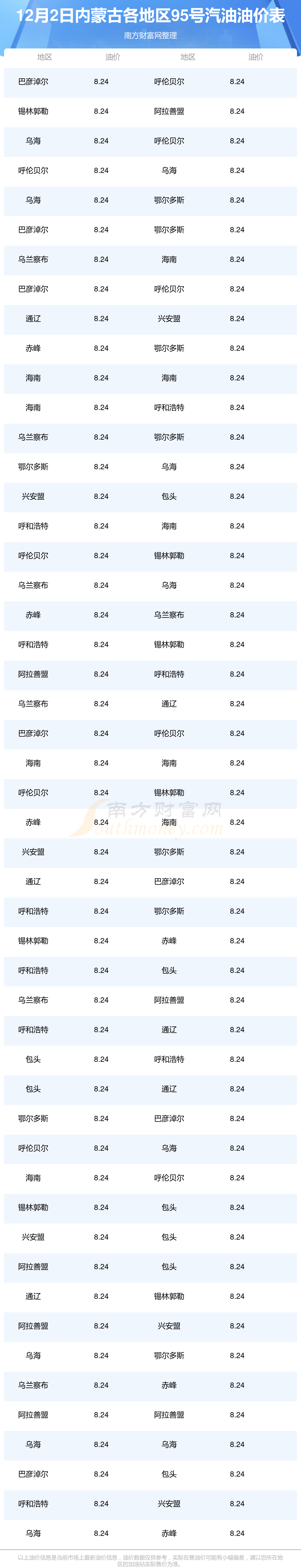 2025年12月2日內(nèi)蒙古95號汽油最新價格一覽表
