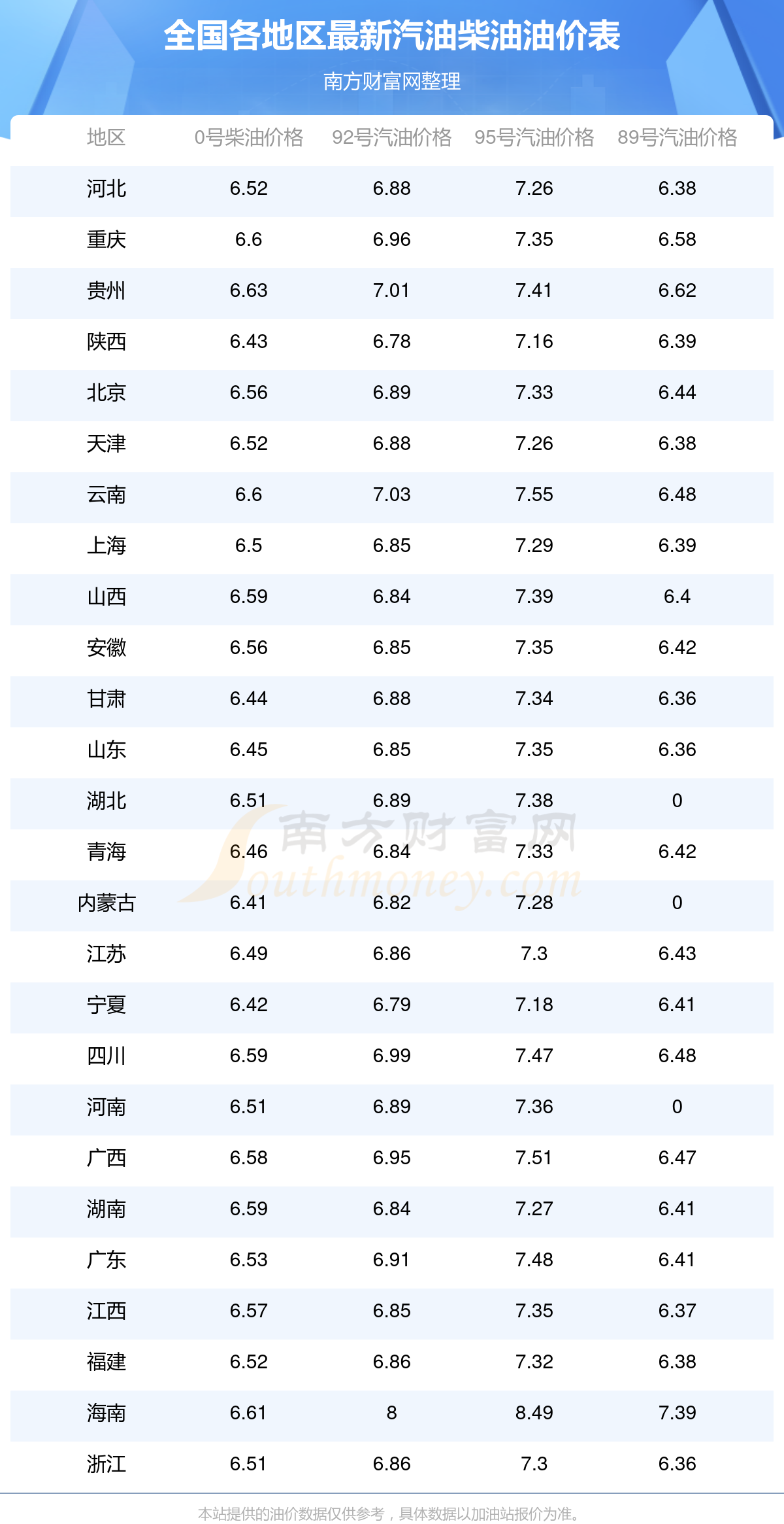 以上數(shù)據(jù)僅供參考,請以您所在地區(qū)的加油站實際售價為準(zhǔn)。南方財富網(wǎng)發(fā)布此信息的目的在于傳播更多信息,對使用該油價信息所導(dǎo)致的結(jié)果概不承擔(dān)責(zé)任。