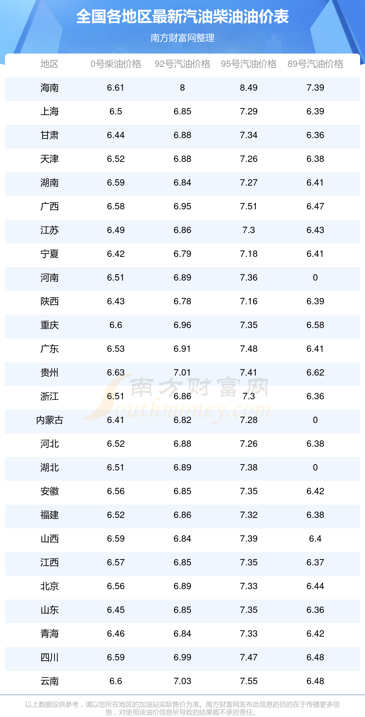 以上數(shù)據(jù)僅供參考,請以您所在地區(qū)的加油站實際售價為準。南方財富網發(fā)布此信息的目的在于傳播更多信息,對使用該油價信息所導致的結果概不承擔責任。