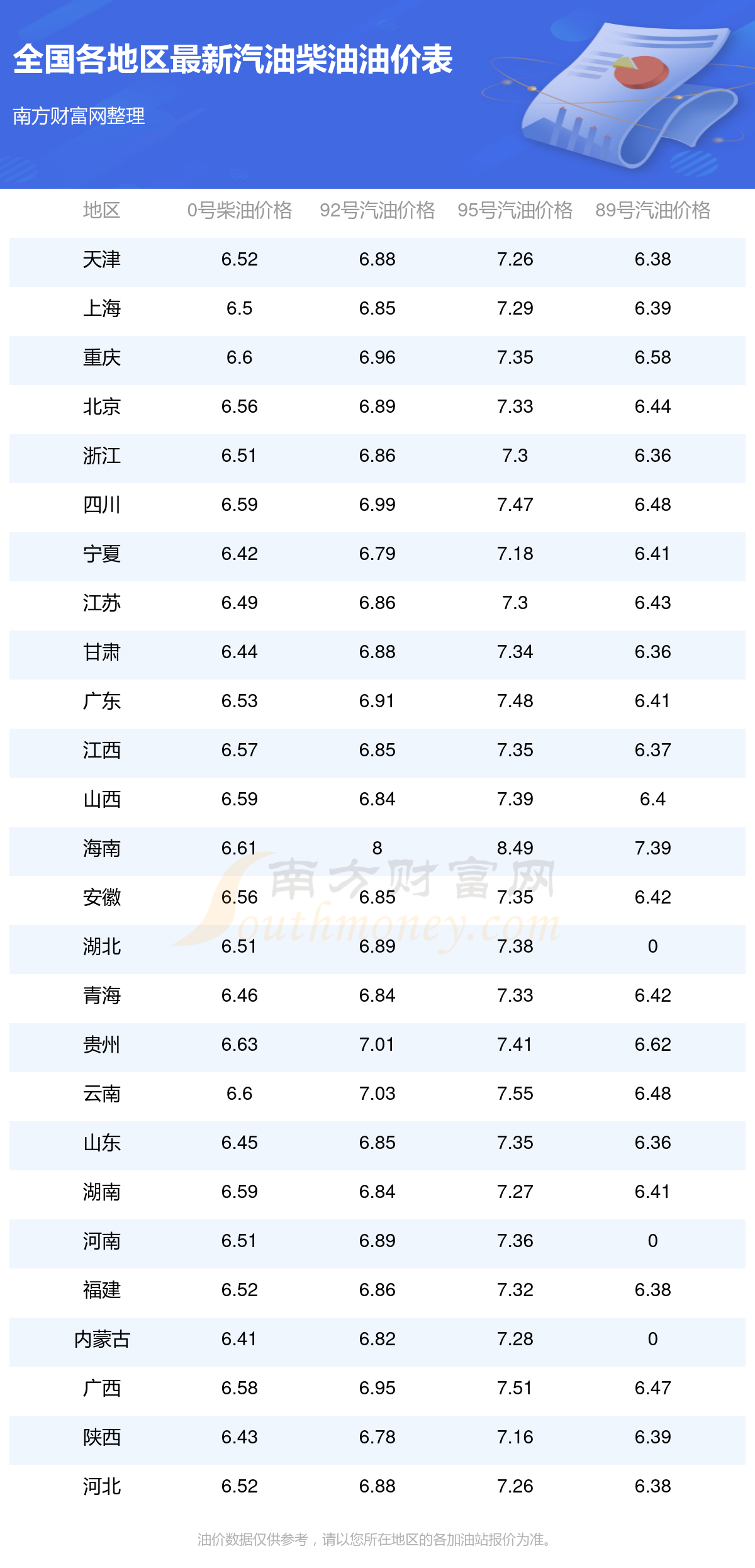 2025年12月2日全國(guó)各地汽油價(jià)格一覽表