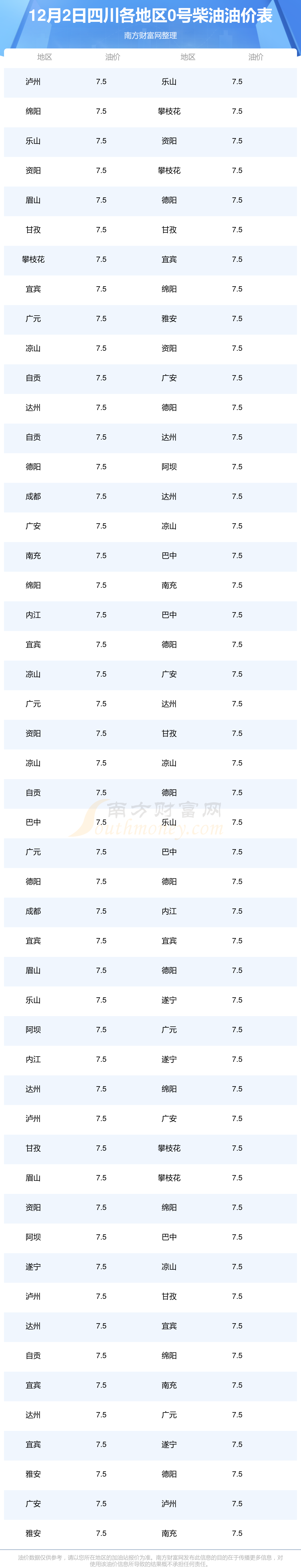 12月2日,四川0號柴油的價格是6.59元每升,本次的調(diào)整時間為11月25日,對比上次的調(diào)整減了0.05元,減0.753%,12月8日24時為下一輪油價調(diào)整時間,還有6.24天。