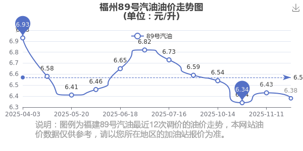 油價調(diào)整最新消息:福州汽油、柴油12月2日每升最新價格:92號汽油為6.86元;95號汽油為7.32元;89號汽油為6.38元;0號柴油為6.52元,本輪油價調(diào)整時間為11月25日。福州下一輪油價調(diào)整時間12月8日24時,距離現(xiàn)在還有6.23天。