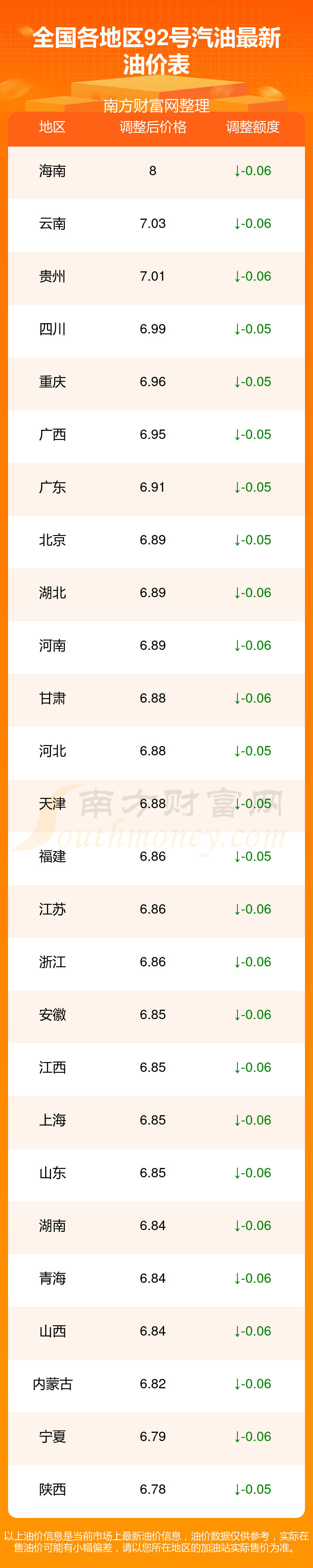 全國92號汽油最新平均價格為:7元每升,其中,最高為海南,價格為8.00元/升,最低為陜西,價格為6.78元/升。