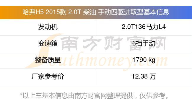 在動力上,哈弗H5 2015款 2.0T 柴油 手動四驅(qū)進(jìn)取型配備的是一臺2.0T136馬力L4渦輪增壓發(fā)動機,匹配的是6擋手動擋變速箱,燃料形式為柴油,常規(guī)整備質(zhì)量1790kg,廠家參考價12.38萬元。