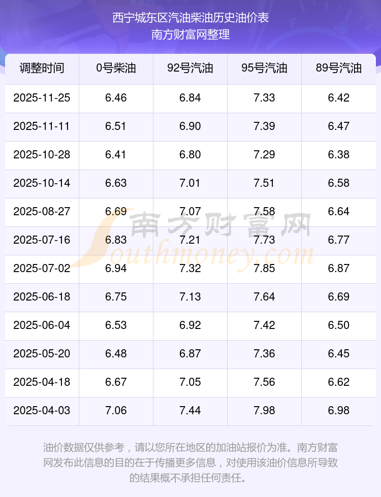 西寧城東區(qū)汽油、柴油12月2日每升的價格為11月25日調(diào)整后的價格,具體油價為:92號汽油6.84元;95號汽油7.33元;89號汽油6.42元;0號柴油6.46元。