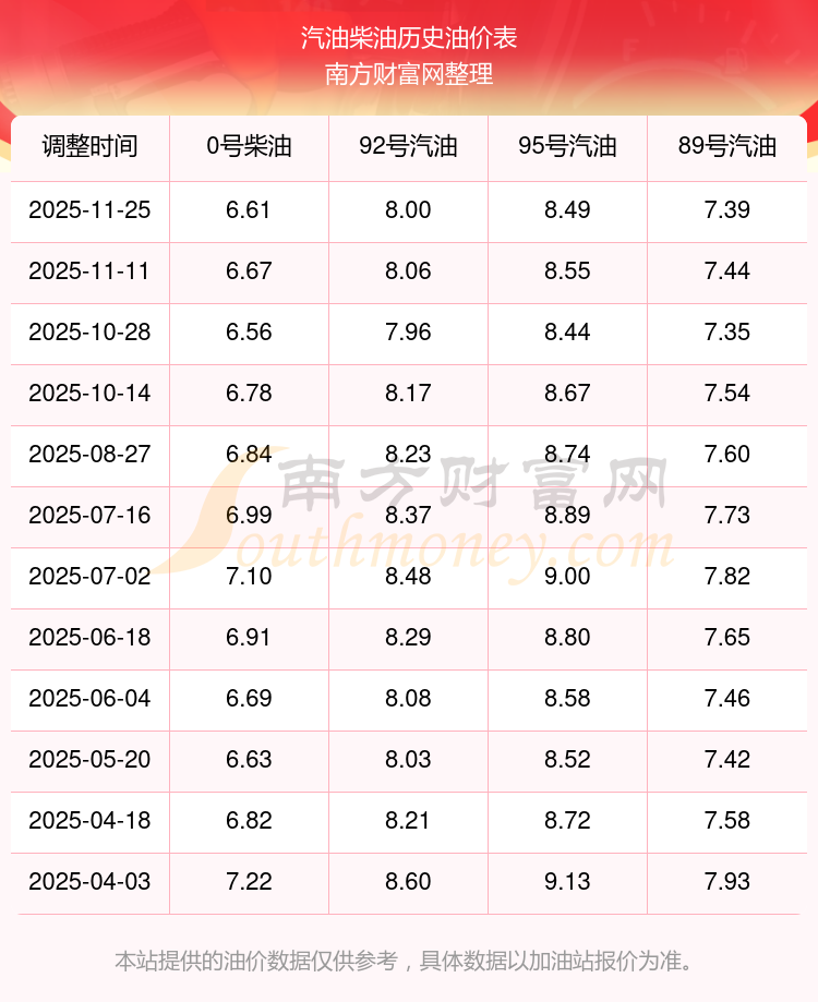 樂東95號汽油12月2日最新價格為8.49元/升,調(diào)整時間為11月25日,相對上次調(diào)整時間11月11日的油價8.55元每升,下調(diào)了0.06元,下調(diào)0.702%。下一輪油價調(diào)整時間12月8日24時,距離現(xiàn)在還有6.21天。